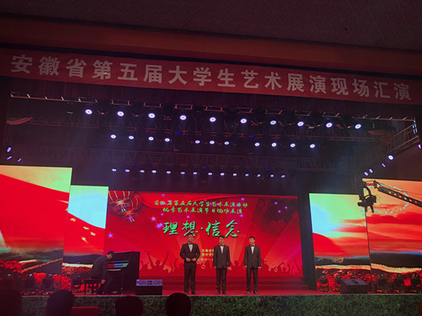 在此前全省的大学生艺术展演评比中,我校大学生艺术团选送的5个作品全部获奖,重唱《等你到天明》获声乐类甲组一等奖,并被推荐参加安徽省现场展演,小合奏(弦乐)《化装舞会上的探戈》获器乐类甲组二等奖,合唱《远情》《瑶山夜歌》获声乐类甲组三等奖,民乐小合奏《高山流水》获器乐类甲组三等奖,群舞《除夕夜》获舞蹈类甲组三等奖,我校更是荣获安徽省大学生艺术展演活动“优秀组织奖”。