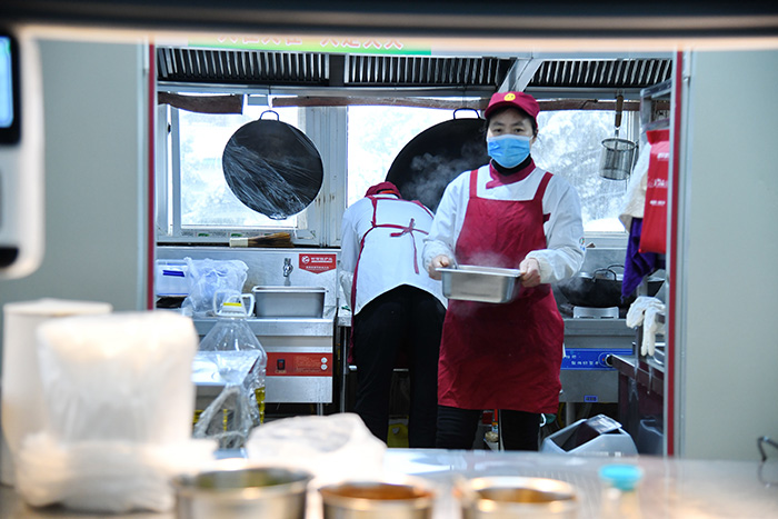 寒冷冬日,食堂里氤氲水气诉说着这里的烟火气——仍有餐饮窗口为保障留校师生的一日三餐而忙碌着,以守住他们“舌尖上的幸福”。