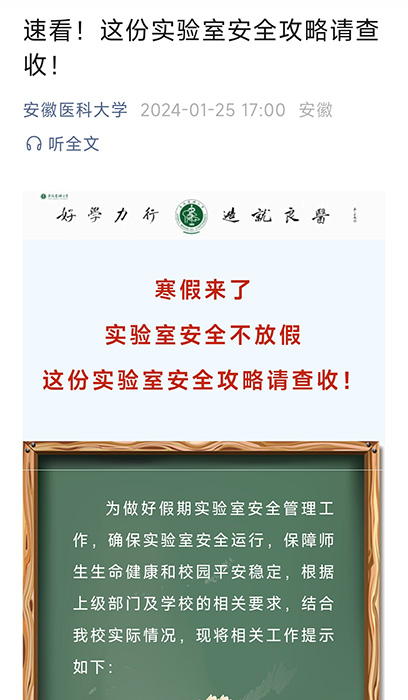 连日来,学校各部门、各学院及时传达落实此次安全检查中校领导提出的具体意见,严格落实“四方责任”和“三管三必须”要求,扎实开展隐患排查整治工作特别是组织开展起底式、拉网式的全覆盖消防安全整治行动,坚决杜绝隐患排查不深入、不全面等问题,确保不留死角、不留盲区。同时,聚焦重点领域和关键环节,对安全责任是否清晰明确、安全台账是否完善、安全隐患排查整治是否闭环管理、是否存在重大安全隐患等内容进行重点检查,做到“有患必除、除患务尽”;针对安全生产一线员工等进行安全教育培训,叮嘱其要时刻绷紧安全生产思想之弦,保障好学校财产和师生安全;在学校官方微信公众号等平台向全校师生发布假期实验室安全工作提示,多渠道宣传实验室安全知识,提升师生安全意识和防护技能。