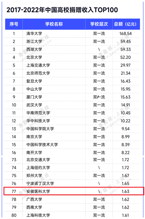 据了解,“2017-2022年中国高校捐赠收入TOP100榜单”是高绩根据基金会中心网(CFC)和慈善中国官方发布的最新数据,对“双一流”建设以来中国内地高校6年(2017-2022年)社会捐赠总收入进行的统计排名,安徽高校仅有三所入围,我校位列第二。校教育基金会将继续专注于自身公益能力建设,不断推进基金会高质量发展,引入更多的优质办学资源,服务学校建设发展大局。(教育基金会 张媛媛)