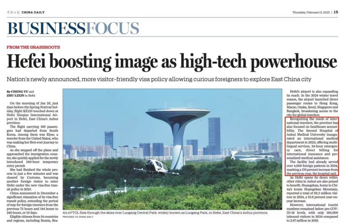 2月13日,《中国日报(CHINA DAILY)》第15版整版聚焦安徽,以《合肥提升高科技强国形象》为题报道了中国全面放宽过境免签政策后的第一个春节期间,外国友人畅游合肥的切身体验,主稿中特别对我校第二附属医院国际医疗部的国际化优质服务和发展成就进行了介绍。