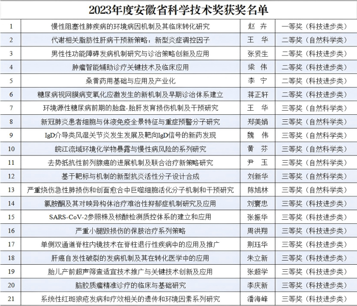 近日,安徽省科技创新大会在合肥召开。大会对2023年度为安徽科技进步、经济社会发展和国际交流合作作出突出贡献的个人和组织进行了表彰。我校以第一完成单位获得21项2023年度安徽省科学技术奖,获奖数位列省属高校第一位。